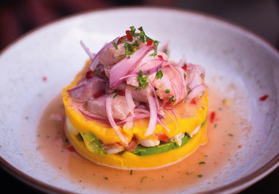 Maki relleno de palta, queso crema y langostino crocante. Cubierto por pesca del día y salsa acevichada. (10 und) *Válido solo fines de semana*