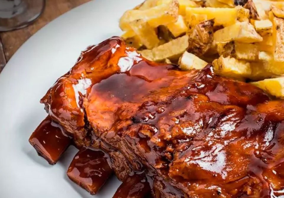 Deliciosas chuletas a la parrilla, bañadas con salsa de durazno y acompañadas con puré de papa de la casa.