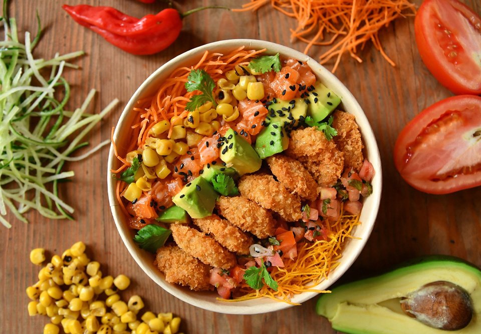 Cangrejo ahumado/60 g, choclo, palta, pepino, tomate cherry y quinoa sobre la base que prefieras. Se acompaña de 2 salsas a elección
