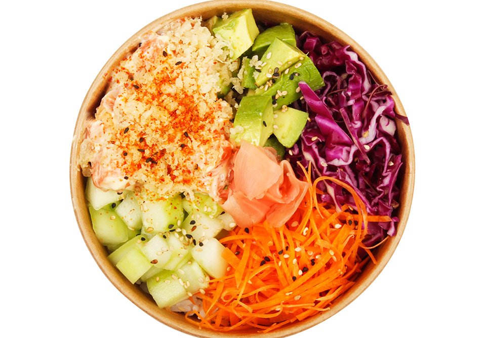 Base de arroz, ajonjoli mixto, col morada, zanahoria, pepino, palta y acompañado con salmón fresco, tenkasu, limón y gari. con Salsa SHOYU