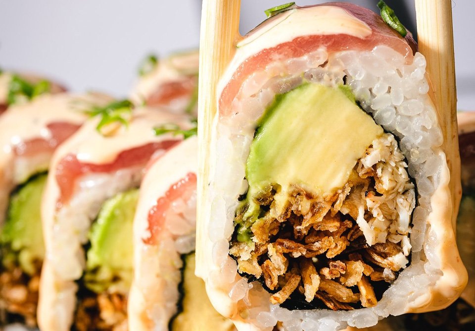 Relleno de tartar de cangrejo picante, langostino empanizado y palta cubierto en láminas de atún. Acompañado de salsa sriracha mayo y soya