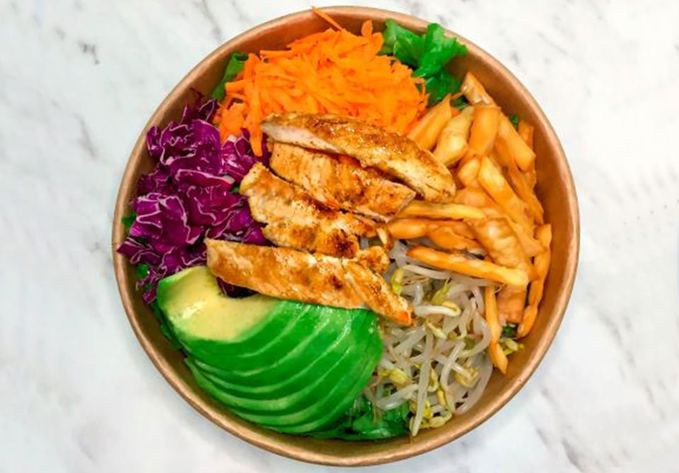 Lechuga Orgánica, zanahoria rallada, palta, frejol chino, wantan frito, col morada y filete de pollo con salsa Teriyaki.