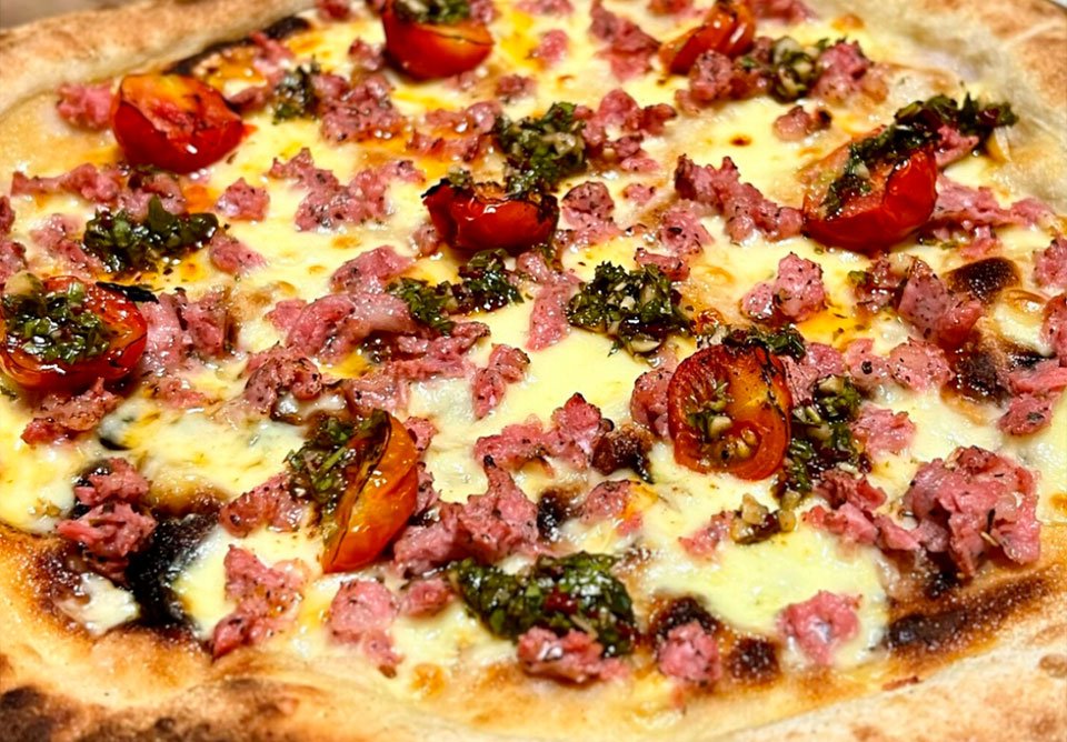 Peperoni ahumado, mozzarella natural, orégano, salsa elaborada con tomate italiano san Marzano y masa artesanal