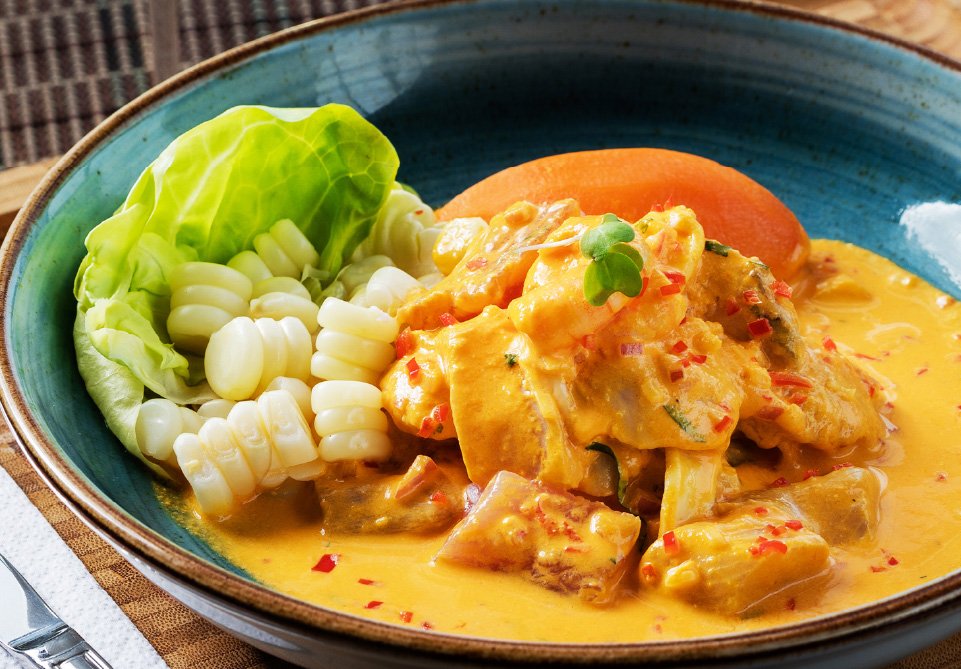 Rellena de sabroso cangrejo acompañada con ceviche en cremas de ajíes.