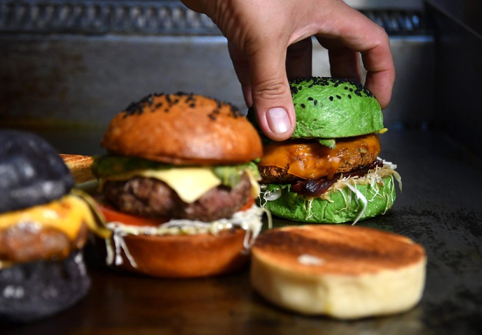 Hamburguesa de 130 g. a la parrilla, queso, piña, tocino, salsa BBQ picante, pickles y tártara de kimchi-condimento Coreano en pan negro al vapor