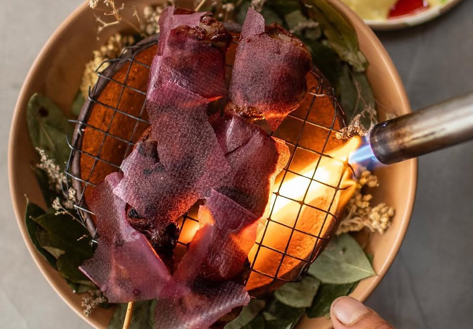 Panceta rostizada servida sobre tortillas artesanales, encurtidos, mayonesa de ají panca