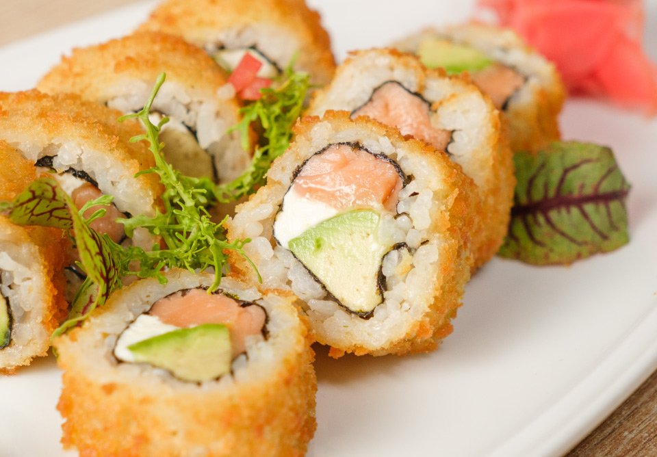 pulpa de cangrejo,palta ,langostinos furai,x fuera atun bañado con salsa nikei