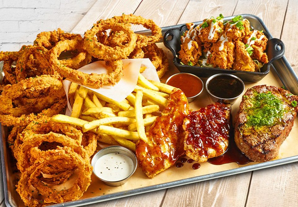 8 pechugas de pollo marinadas al ajo, servidas sobre una base de creamy marinara, Fridays™ sesame chicken strips, pasta linguine cubierta con bruschetta marinara (salsa marinara, tomate fresco, hojas de albahaca, aceite de oliva y ajos), oreo brownie bañado con salsa de caramelo. Por todo el mes de Junio llévate GRATIS 1 Party Cocktail Mojito.