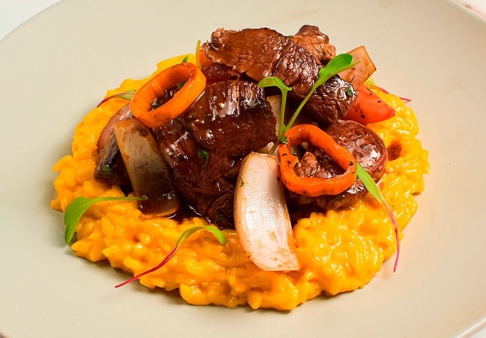 Lomo fino, salteado al wok, tomates y cebollas, servido con papas crocantes y arroz.