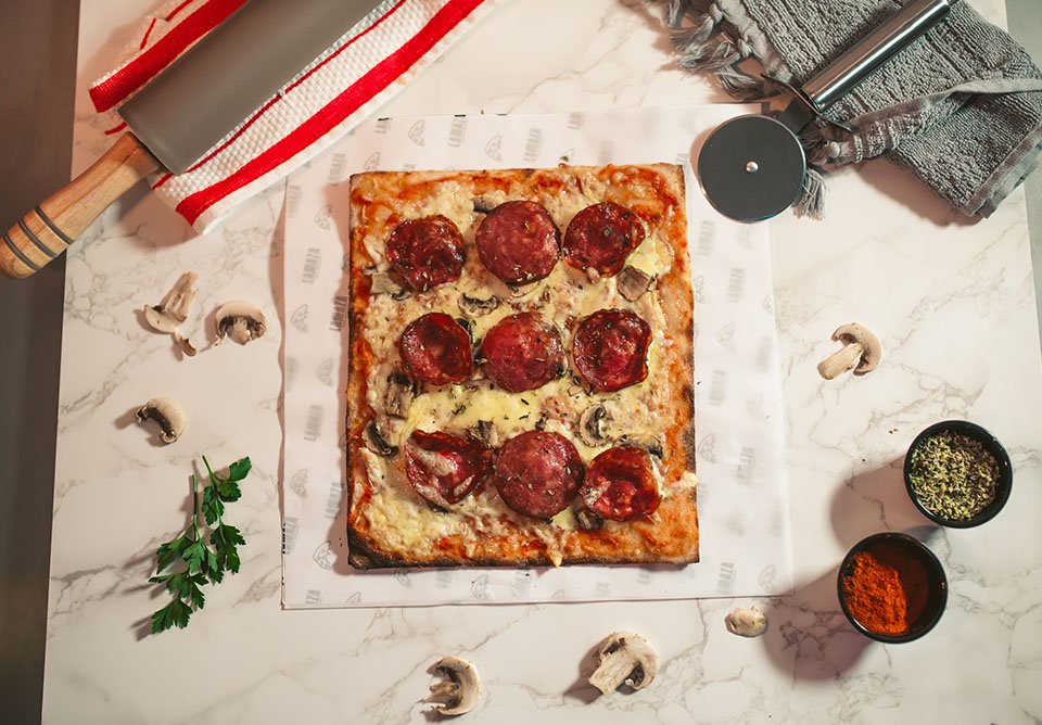 Pizza grande con masa delgada, salsa pomodoro, mozzarella artesanal y salame.