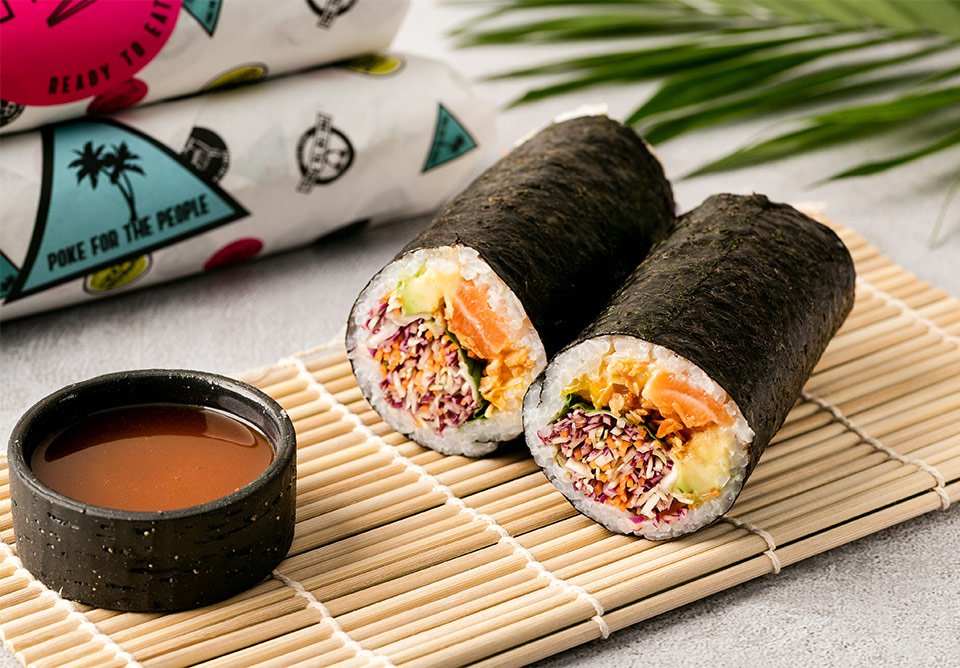 Poke roll de mushroom mix, edamame, mix greens y nori crocante con salsa yuzu-ponzu trufada.