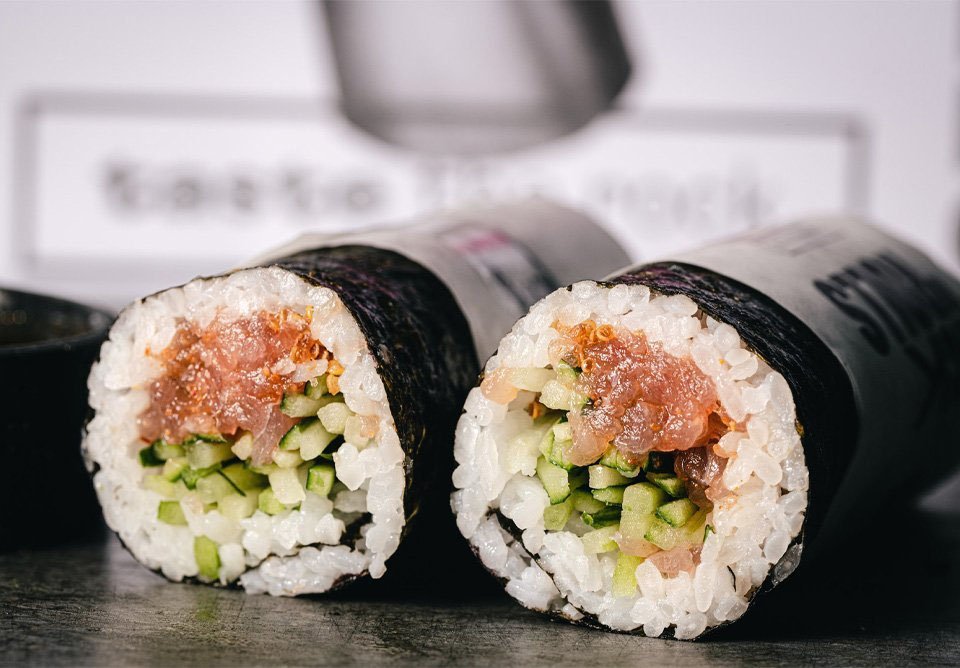 Relleno de tartar de atún y pepino japonés envueltos en alga nori. Acompañado de salsa ponzu especial y soya